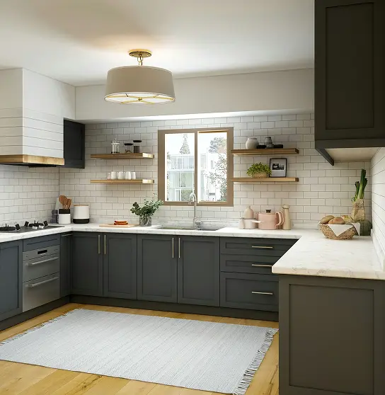 The first floor features a bright and open living area with a dining space and a fully equipped kitchen with island countertop, ideal for preparing meals at home. Large 8-foot sliding glass doors open onto a private terrace, creating a seamless indoor-outdoor living experience. A convenient half-bathroom completes this level.